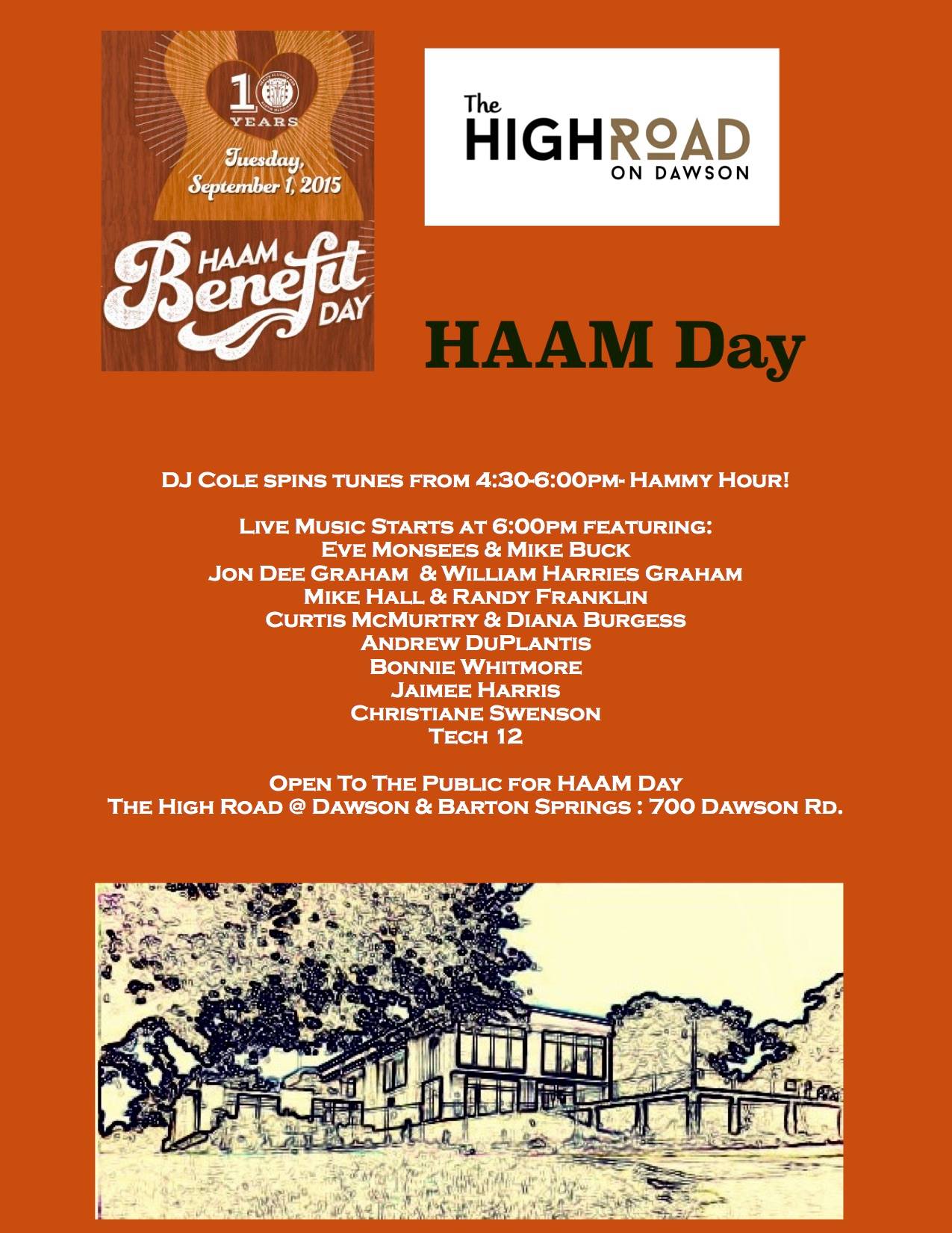 11907841_883688045044098_8197043816108180522_o copy Next Published August 1, 2016 at 1275 × 1650 in The High Road on Dawson sponsors an event to raise funds for Austin musicians Health Alliance for Austin Musicians (HAAM) event flyer.