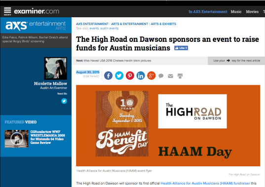 Screen Shot 2016-07-07 at 3.43.13 PM Previous Published August 1, 2016 at 1163 × 823 in The High Road on Dawson sponsors an event to raise funds for Austin musicians Screenshot from the original publication on Examiner.com.