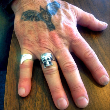 bill-hand Previous Next Published August 2, 2016 at 545 × 547 in Tears of Diamonds & A Heart of Silver: The Legendary Bill Carter and The Blame Bill Carter’s right hand, primarily the pirate skull ring given to him by close friend and fellow artist, Johnny Depp. Photography by the writer, Nicolette Mallow.