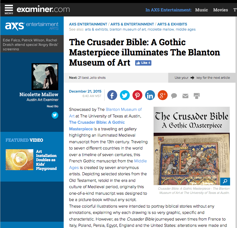Screen Shot 2016-07-07 at 3.59.42 PM Previous Next Published August 2, 2016 at 789 × 761 in The Crusader Bible: A Gothic Masterpiece illuminates The Blanton Museum of Art Screenshot from original publication on Examiner.com.