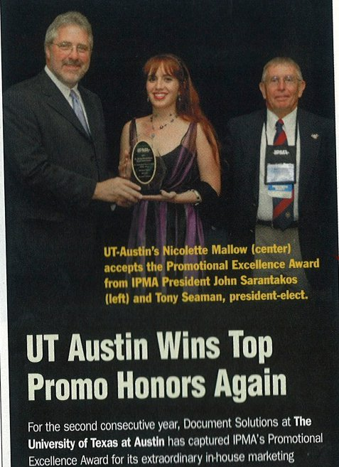 - Created extensive portfolio pieces and proposal letters for the University of Texas at Austin, which was awarded the 2011 “In-House Promotional Excellence Award” for the second year in a row.
