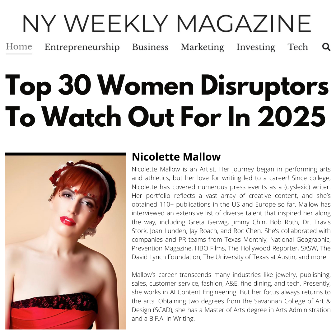 Yes, my artist bio is a great introduction to my career: Nicolette Mallow is an artist. Her journey began in performing arts and athletics, but her love for writing led to a career! Since college, Nicolette has covered numerous press events as a (dyslexic) writer. Her portfolio reflects a vast array of creative content, and she’s obtained 110+ publications in the US and Europe so far.