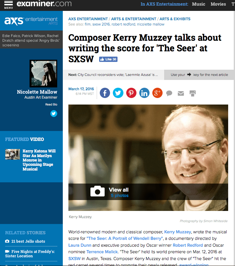 World-renowned modern and classical composer, Kerry Muzzey, wrote the musical score for “The Seer: A Portrait of Wendell Berry”, a documentary directed by Laura Dunn and executive produced by Oscar winner Robert Redford and Oscar nominee Terrence Malick. “The Seer” held its world premiere on Mar. 12, 2016 at SXSW in Austin, Texas. Composer Kerry Muzzey and the crew of “The Seer” hit the red carpet several times to promote their newly released, award-winning documentary. The SXSW Music, Film and Interactive Conferences and Festivals is celebrating its 30th year. And this year “The Seer” was awarded the ‘Special Jury Recognition for Cinematography’ for SXSW 2016.