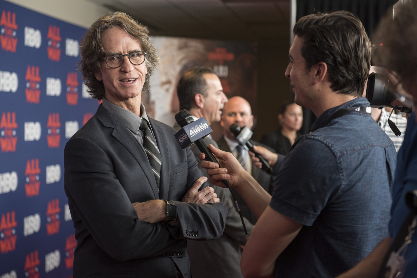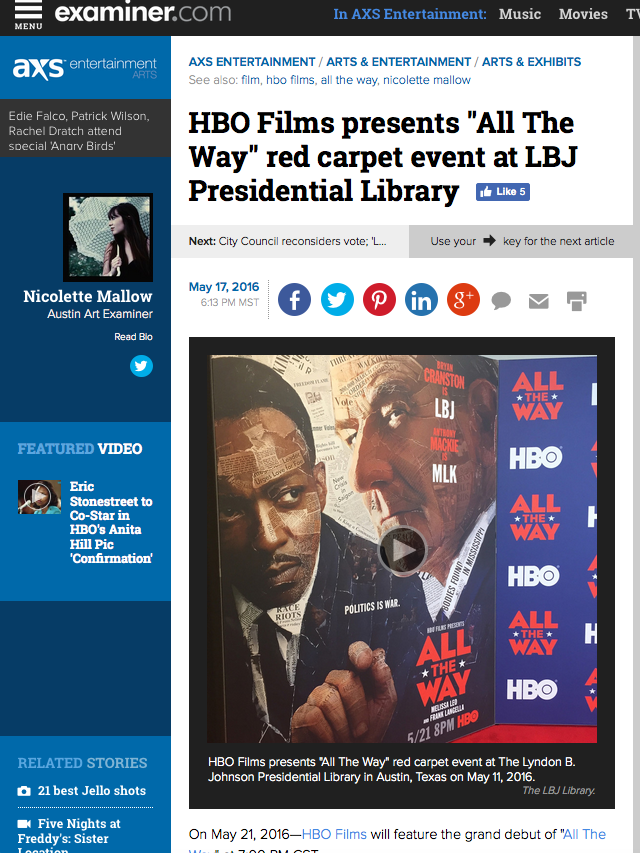 Last week, on May 11, 2016, in Austin, Texas—HBO Films and The Lyndon B. Johnson Presidential Library hosted a special event and exclusive screening of the film. The delightful cast and crew of “All The Way” strolled the red carpet for the Press before the screening of the film. After the movie ended, a Q&A session took place. (A video of the Q&A conversation is online.) Local Arts and Entertainment Writer for Examiner, Nicolette Mallow, attended the red carpet event and she interviewed Director Jay Roach and Writer Robert Schenkkan. Both audio recordings of each interview are uploaded onto YouTube.