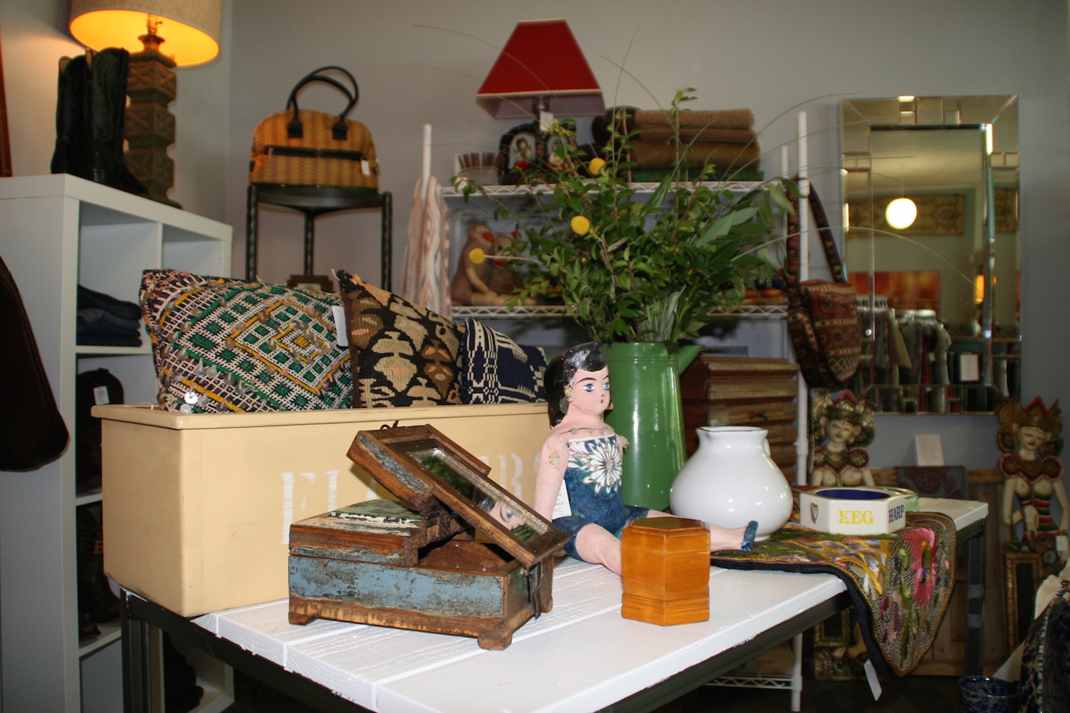 The welcome party at Top Drawer’s second shop in Crestview featured complimentary wine, fruits, cheeses and crackers. All items were 20% off during the party. Entering the thrift shop, guests will notice it’s like an infusion of a high-end fashion boutique, antique library, art gallery and a retro thrift shop with vinyl records and other goodies of the past. Inside the store there is something to be desired for purchase by anyone and everyone. Top Drawer is beautifully decorated and arranged to where the space is filled top-to-bottom with inventory, and yet it does not feel crowded or scattered. The room is neatly organized and the eyes can never get bored. Boots, dresses, books, tables, lamps, giant mirrors, old cameras, artwork, imported goods and other miscellany are available for purchase.