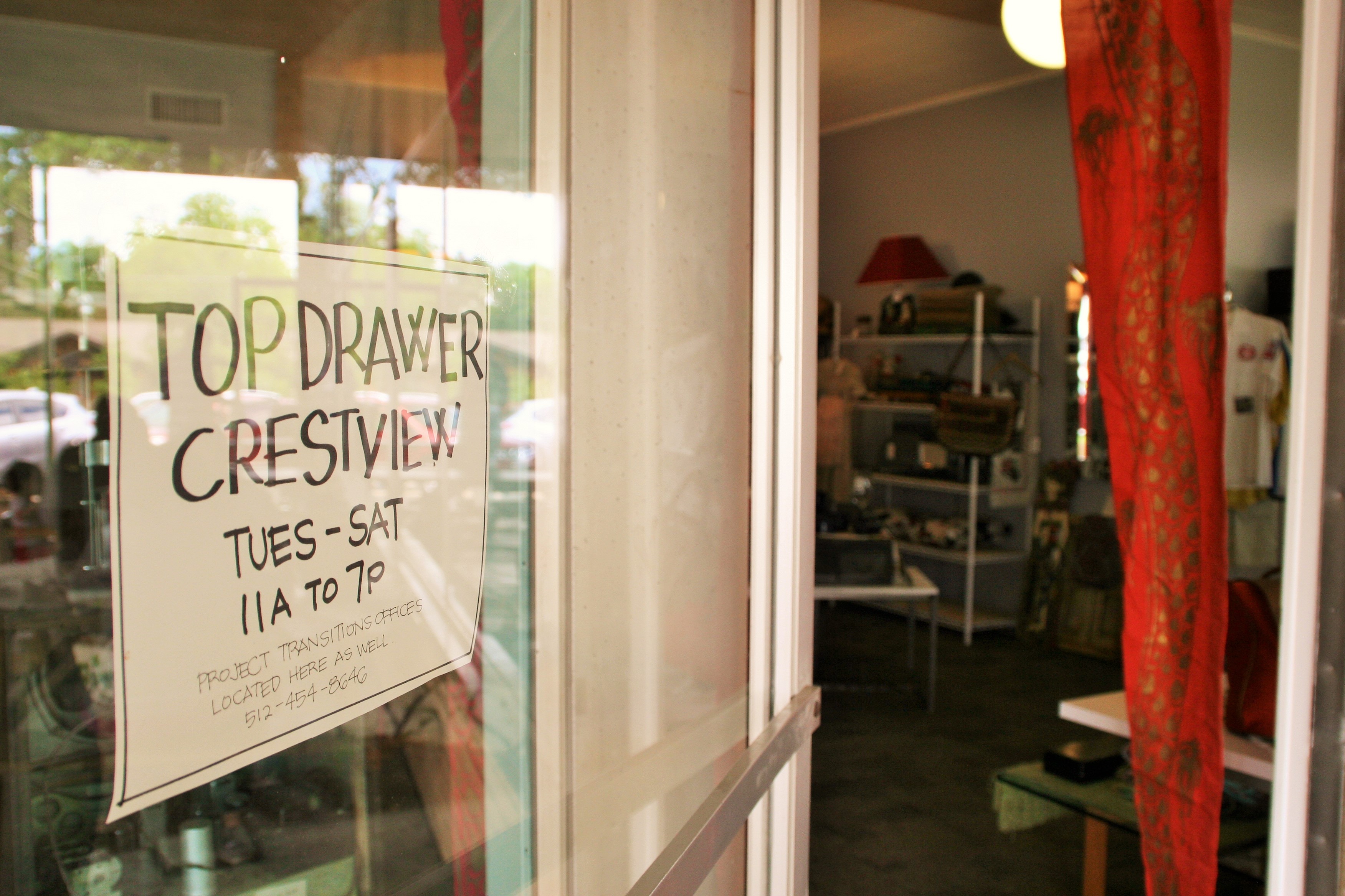 To contact Top Drawer Crestview about acceptable items or more information, please call 512-454-5161. The store hours of operation are 11 A.M. to 7 P.M. every Monday through Saturday. Donations will continue to only be accepted at the Burnet location. For more information about Project Transitions, please visit www.projecttransitions.org or call 512-454-8646.