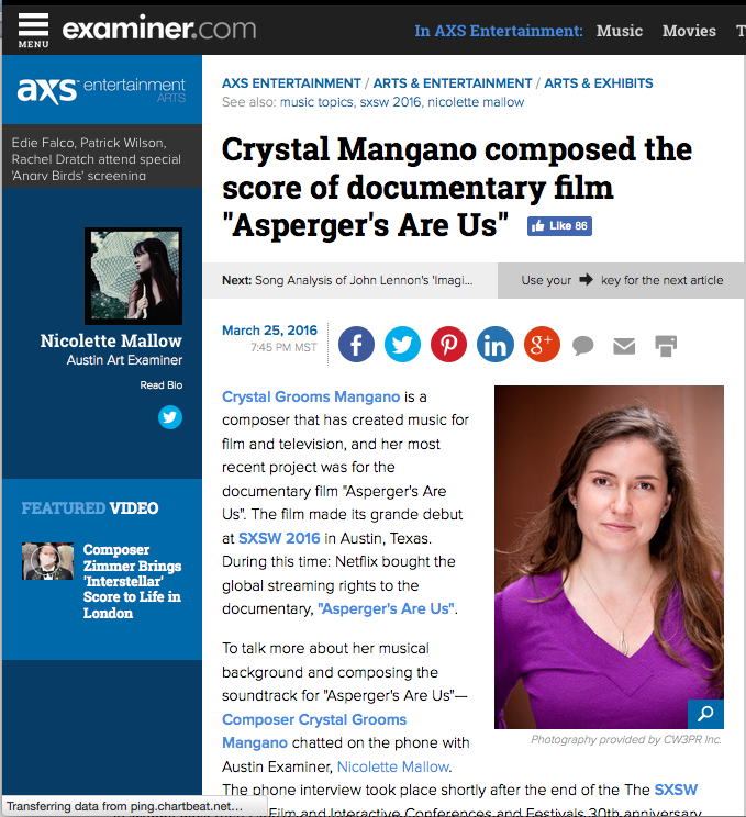 To talk more about her musical background and composing the soundtrack for “Asperger’s Are Us”— Composer Crystal Grooms Mangano chatted on the phone with Austin Examiner, Nicolette Mallow. The phone interview took place shortly after the end of the The SXSW Music, Film and Interactive Conferences and Festivals 30th anniversary held in March 2016.
