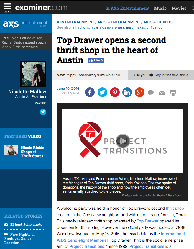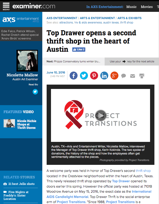 A welcome party was held in honor of Top Drawer’s second thrift shop located in the Crestview neighborhood within the heart of Austin, Texas. This newly released thrift shop operated by Top Drawer opened its doors earlier this spring. However the official party was hosted at 7101B Woodrow Avenue on May 15, 2016, the exact date as the International AIDS Candlelight Memorial. Top Drawer Thrift is the social enterprise arm of Project Transitions. “Since 1988, Project Transitions is a non-profit dedicated to serving people with HIV and AIDS by providing supportive living, housing and hospice in compassionate and caring environments.” Top Drawer’s original location on Burnet Road has been open since 1993, always sustaining a focus to sell items in support of Project Transitions. To this day, all proceeds directly benefit the programs of this nonprofit and volunteers mostly run the shops.
