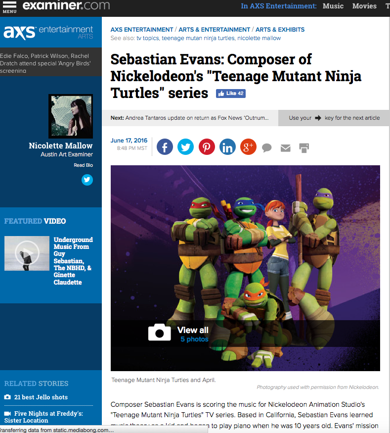 Composer Sebastian Evansis scoring the music for Nickelodeon Animation Studio’s “Teenage Mutant Ninja Turtles” TV series. Based in California, Sebastian Evans learned music theory as a kid and began to play piano when he was 10 years old. Evans’ mission to pursue music began after watching “Return of the Jedi” when he was seven. After participating in various musical entities until he reached college: a jazz band, concert orchestra, drum line and musical theater. Over the course of time Sebastian Evans also taught himself how to score music as a working professional.