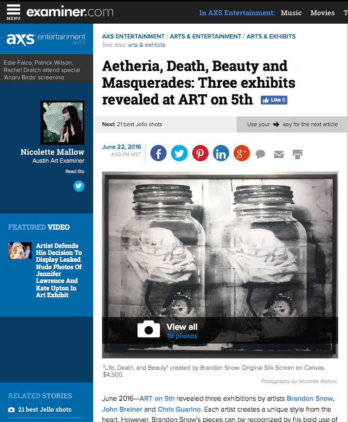 June 2016—ART on 5th revealed three exhibitions by artists Brandon Snow, John Breiner and Chris Guarino. Each artist creates a unique style from the heart. However, Brandon Snow’s pieces can be recognized by his bold use of the colors black and red, butterflies, roses, matches and a balloon. The works of John Breiner are a bit more playful and extensive with bright colors, including images like an eagle, a Native American and an owl. The collection by Chris Guarino reflects a fantasy world of magic, darkness, nature and masks. All three exhibitions and all three artists displayed by the gallery are listed below in fuller details.
