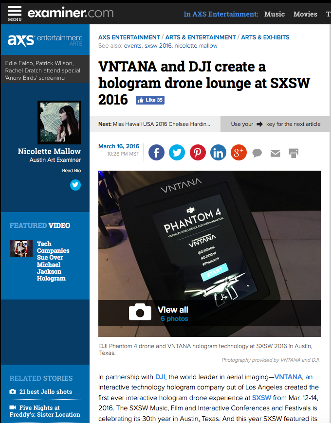 In partnership with DJI, the world leader in aerial imaging—VNTANA, an interactive technology hologram company out of Los Angeles created the first ever interactive hologram drone experience at SXSW from Mar. 12-14, 2016. The SXSW Music, Film and Interactive Conferences and Festivals is celebrating its 30th year in Austin, Texas. And this year SXSW featured its first ever interactive hologram drone pilots between DJI and VNTANA.